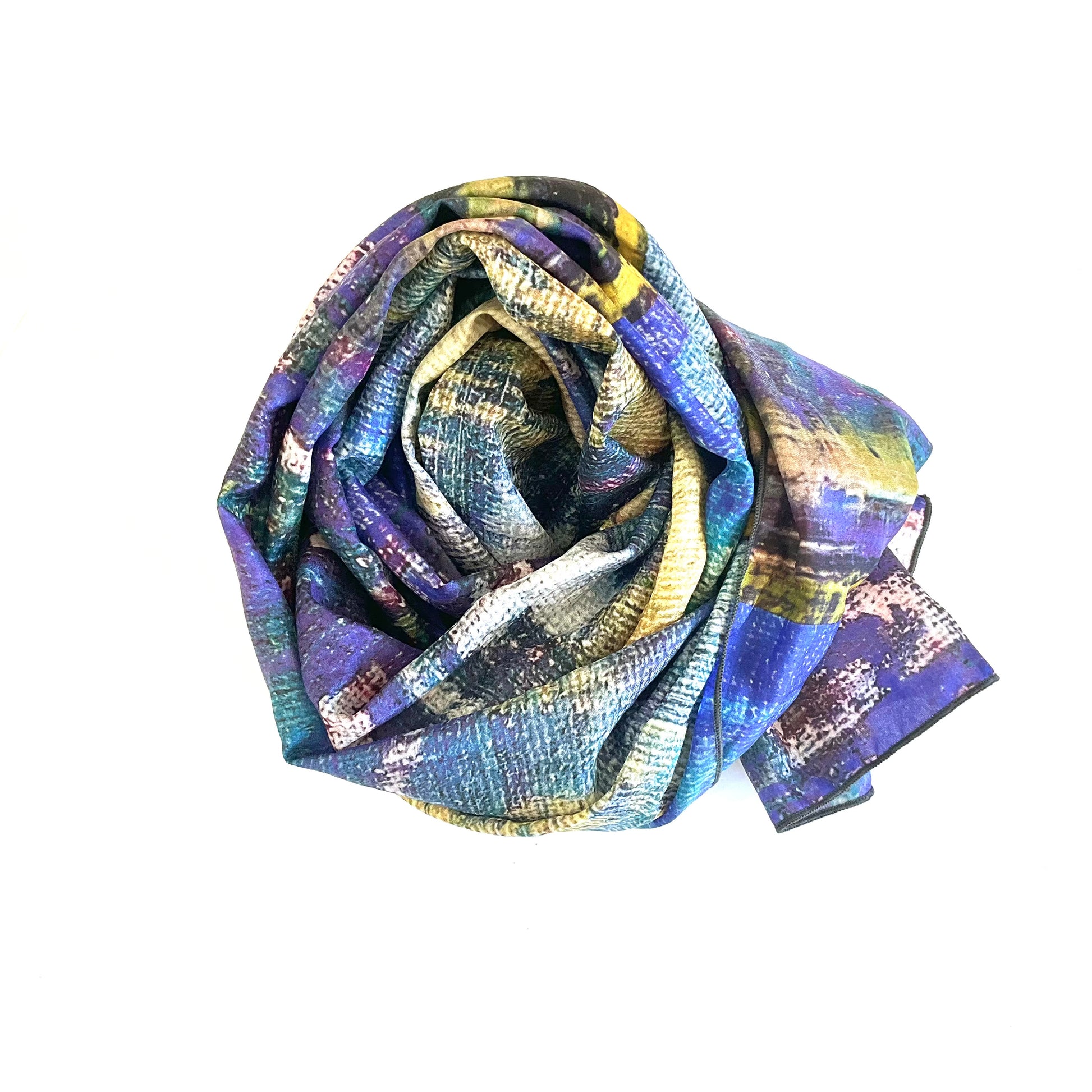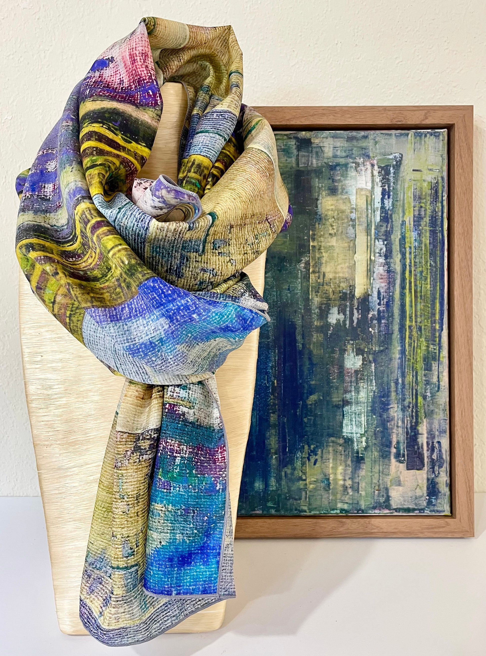 Exquisite limited edition Habotai silk scarf, designed from an original abstract artwork, printed in permanent reactive inks which bond to the silk fibers to create durable, beautifully rich color. This design features vibrant blues, violets and jade green tones. Brilliantly versatile, this can be worn as a neck scarf, as a head scarf, as a shawl, and as a belt. Machine washable.