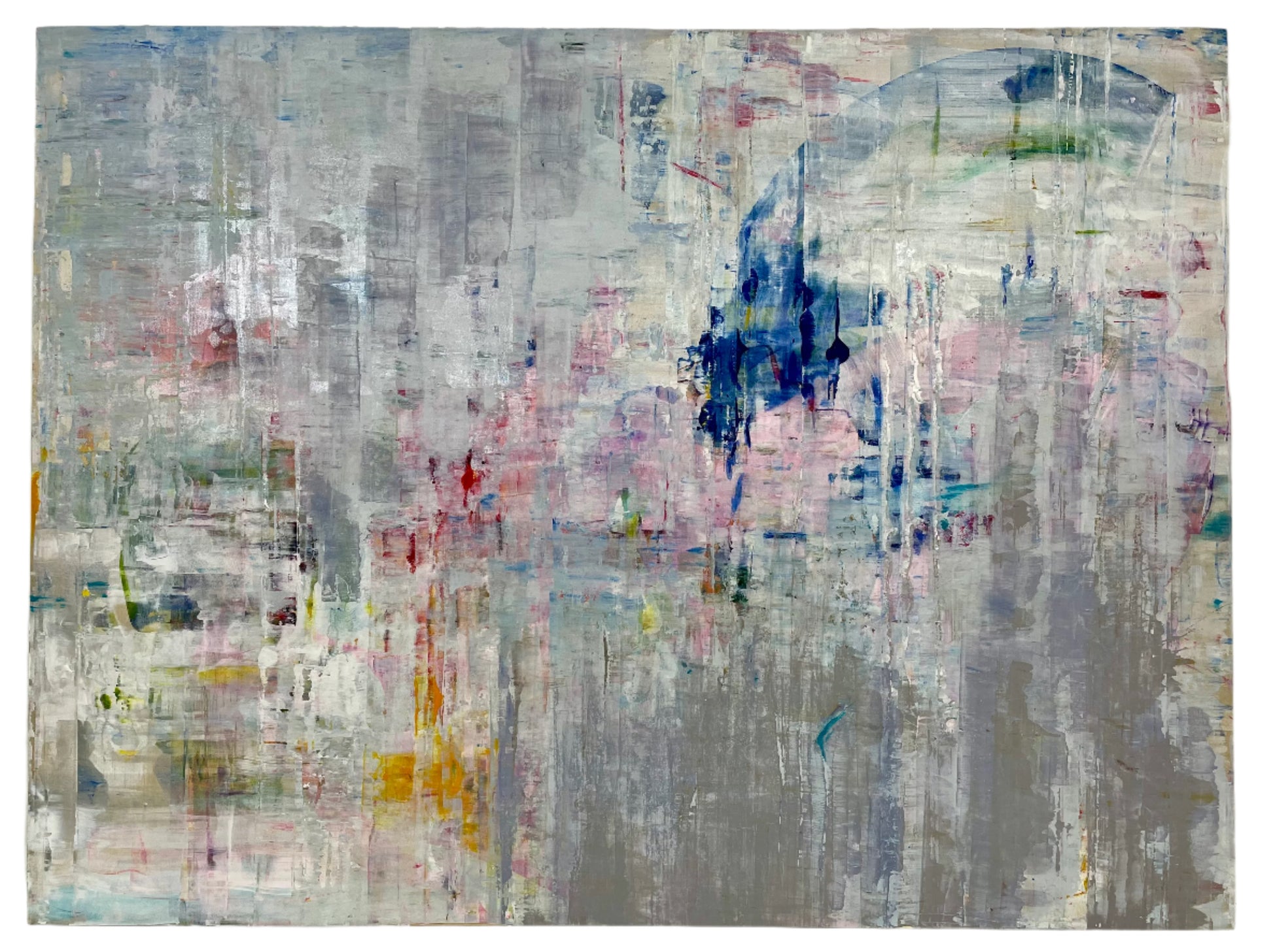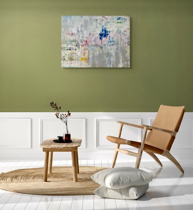 Multi-layered original acrylic painting on wooden panel, featuring soft dove grey, silver, pale lemon yellow, white, rose pink and a pop of teal.