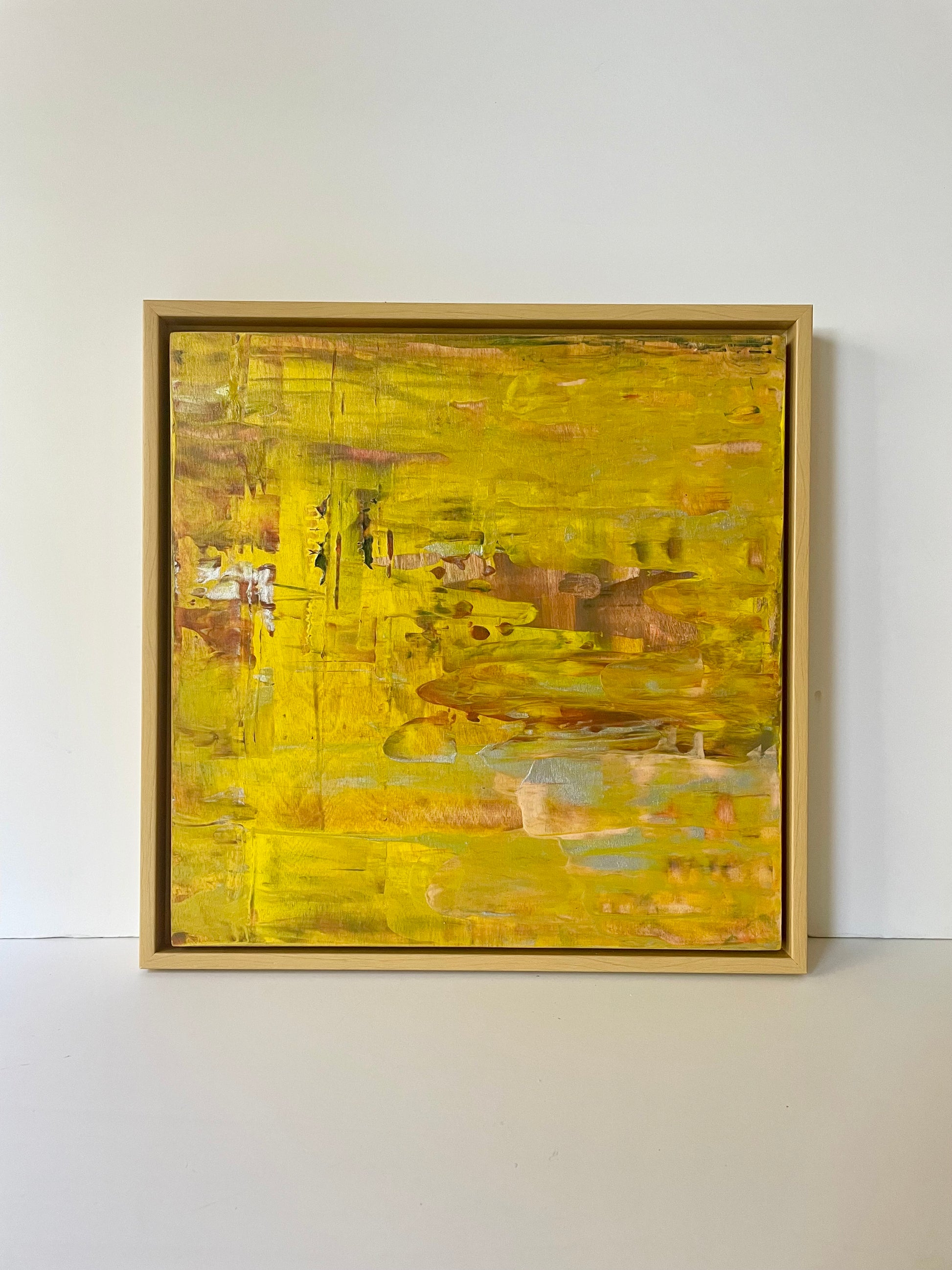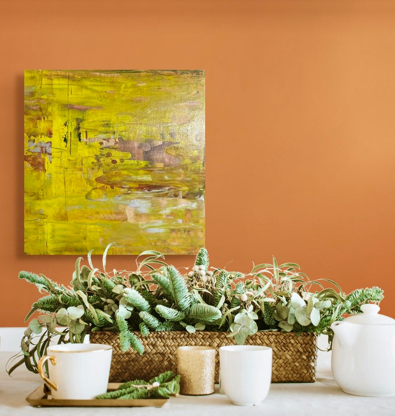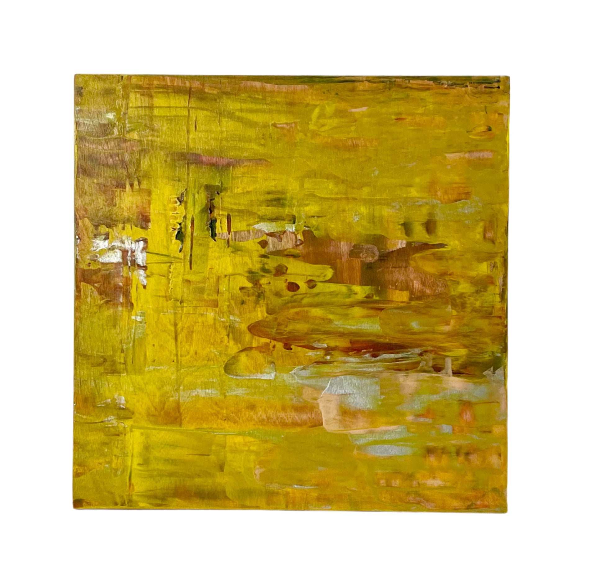 Multi-layered original abstract acrylic painting on wooden panel, featuring warm ochre, rich yellow, taupe, persimmon and a touch of pewter