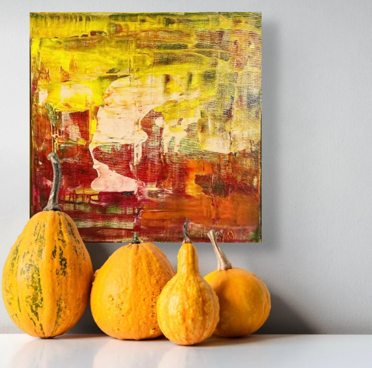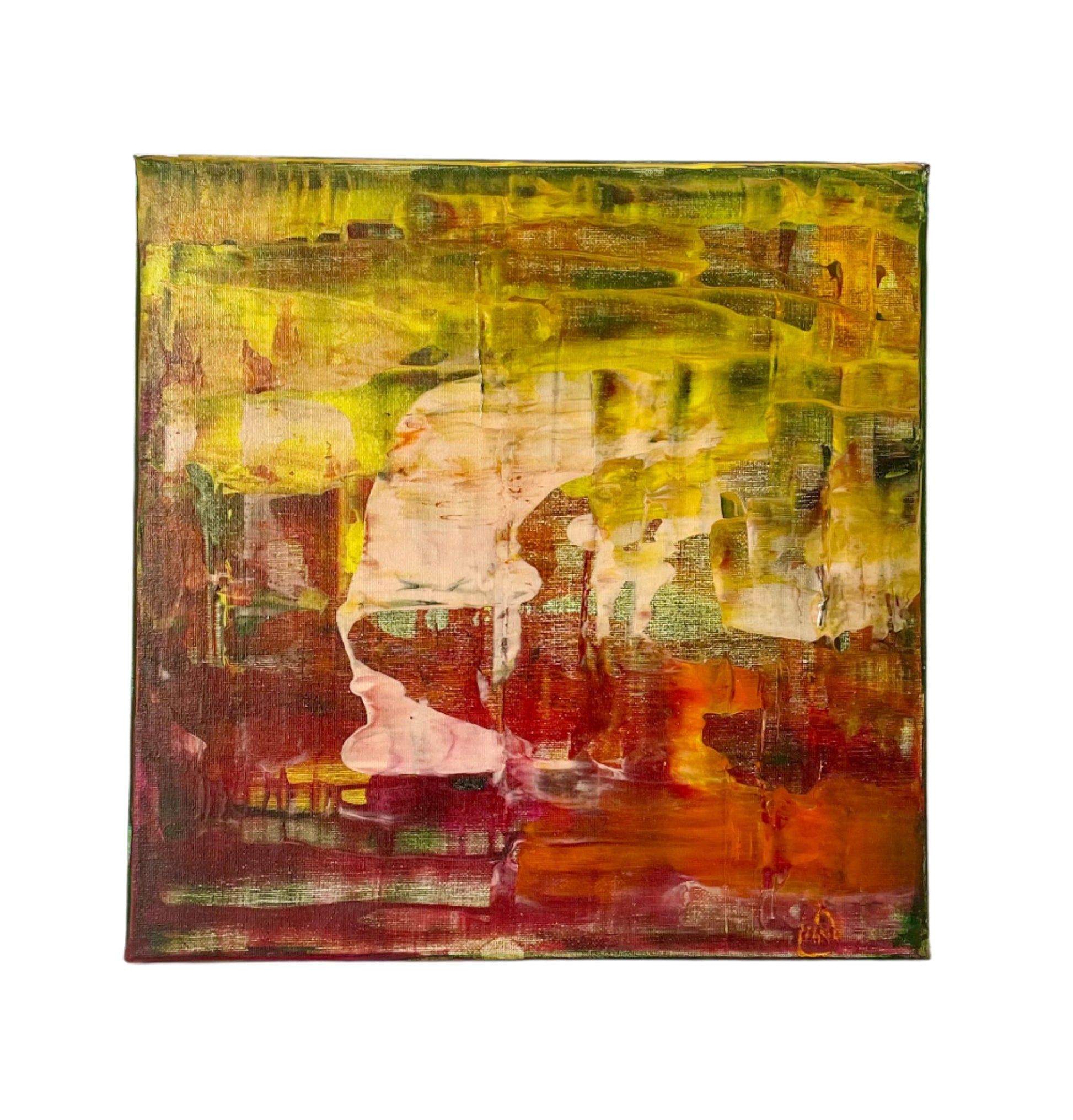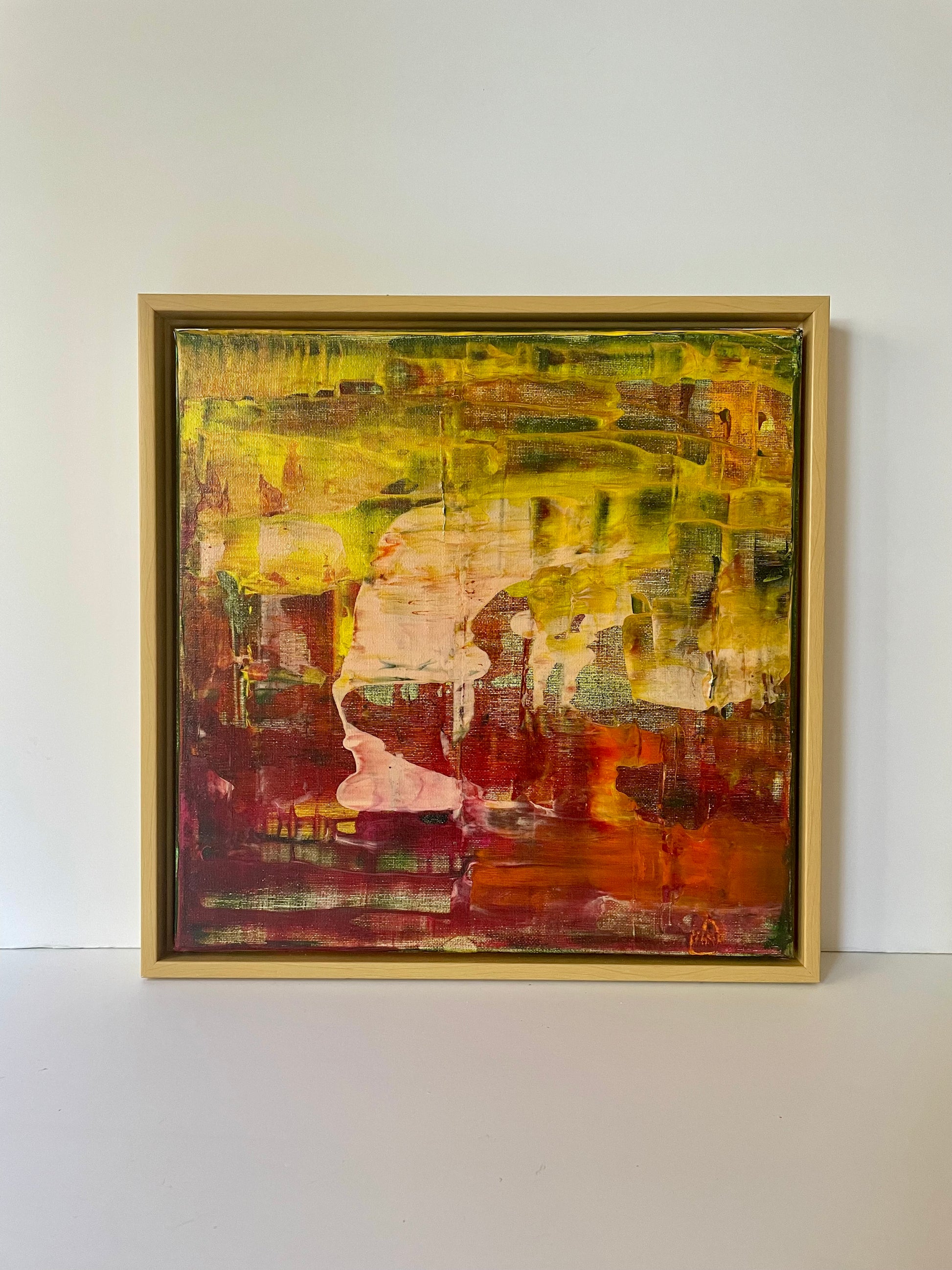 Multi-layered original abstract acrylic painting on canvas, featuring deep yellow, crimson, scarlet, lemon yellow and rhubarb pink.