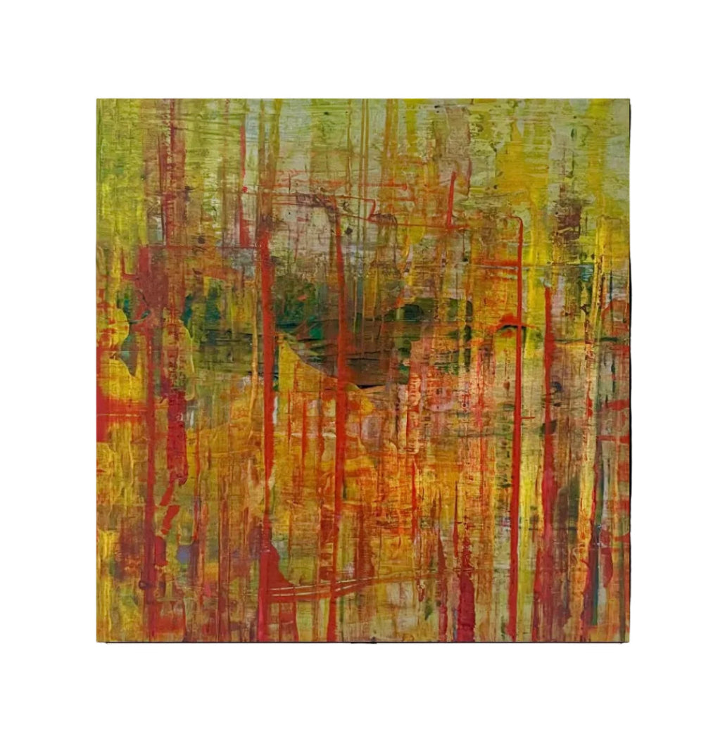 Multi-layered original abstract acrylic painting on wooden panel, featuring silver, lemon yellow, dark green, crimson and vermillion.