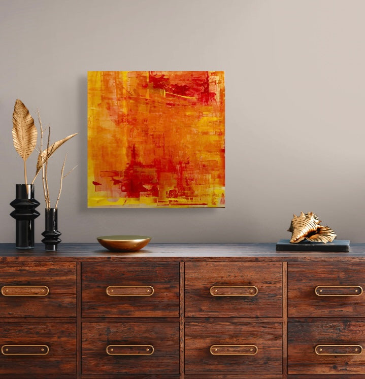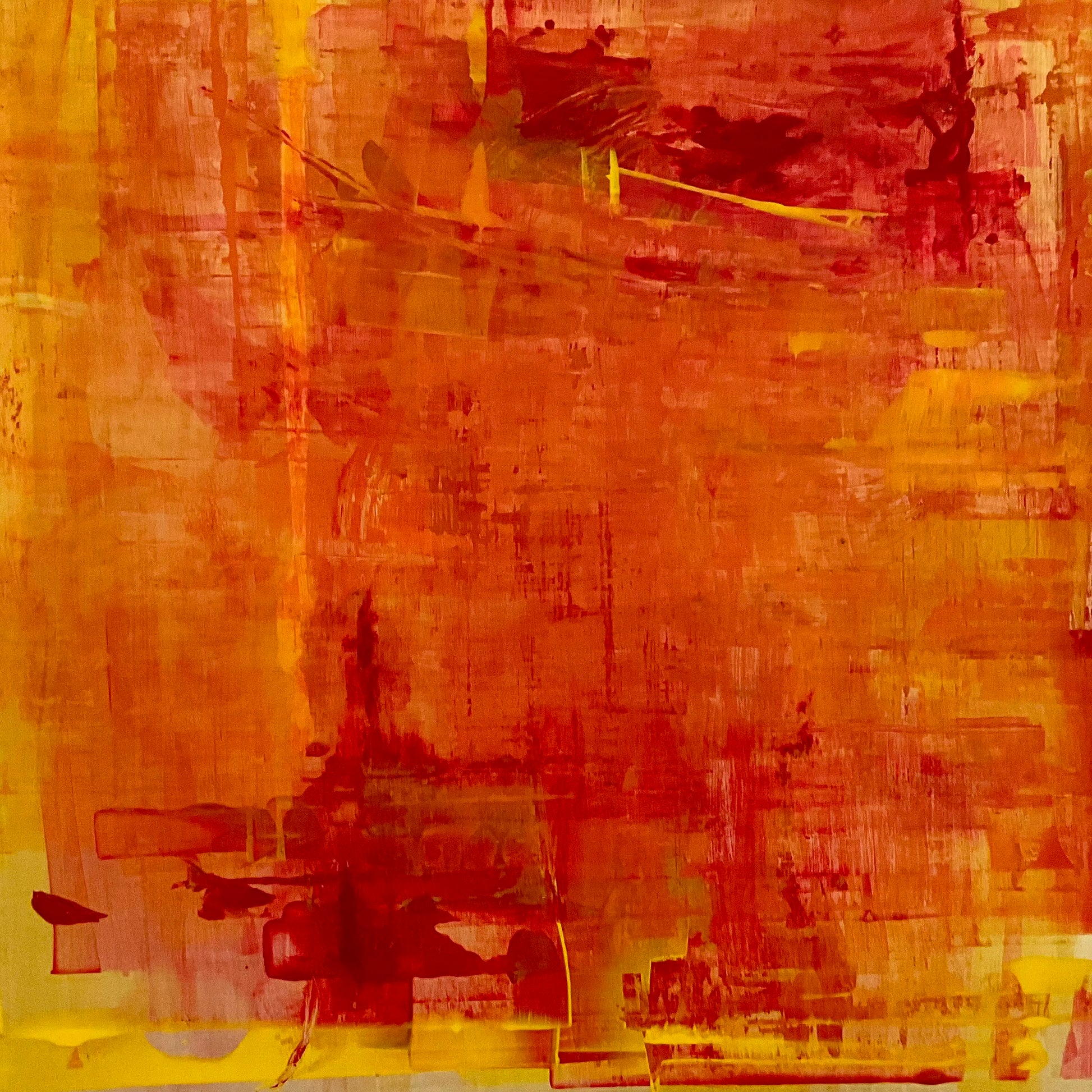 Multi-layered original abstract acrylic painting on wooden panel, featuring crimson, scarlet, saffron yellow, and a fleck of gold.