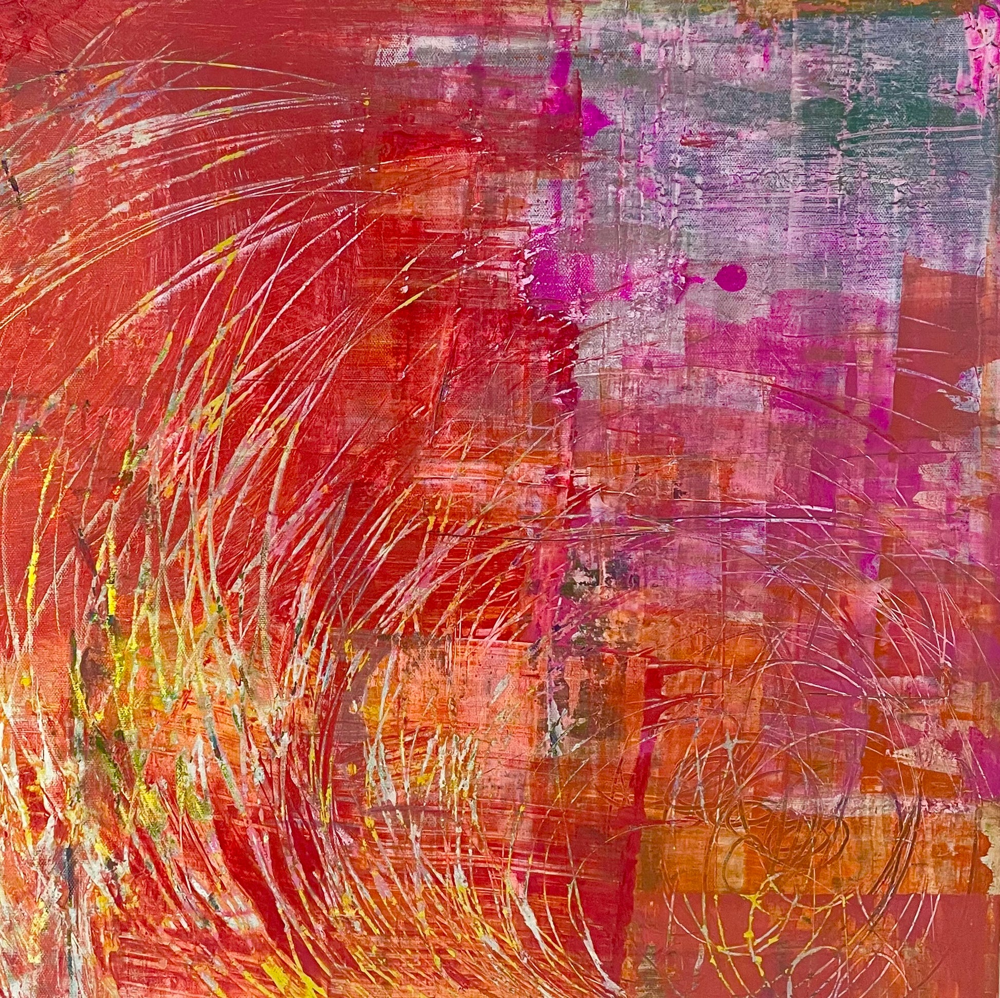 Multi-layered original abstract acrylic painting on canvas, featuring crimson, vermillion, magenta, yellow and a touch of grey and green.
