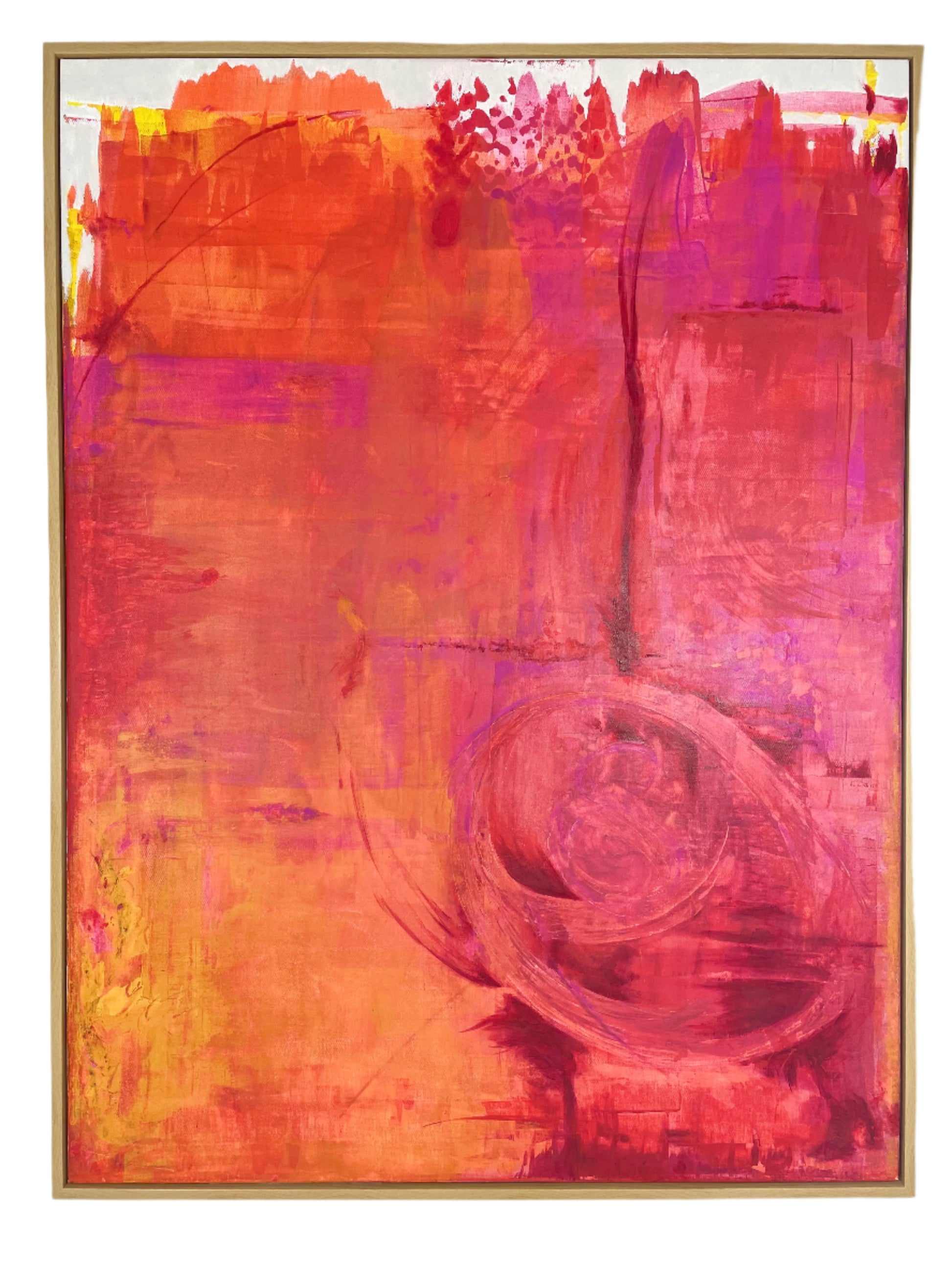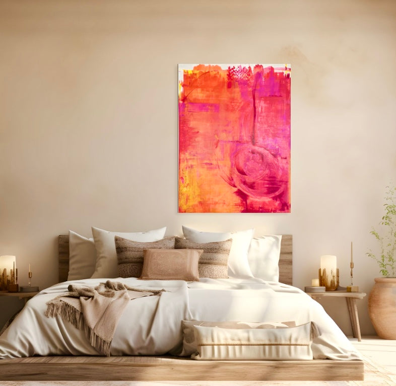 Multi-layered original abstract acrylic painting on canvas, featuring orange, ochre, saffron, crimson, scarlet, golden yellow, soft neon pink and magenta.