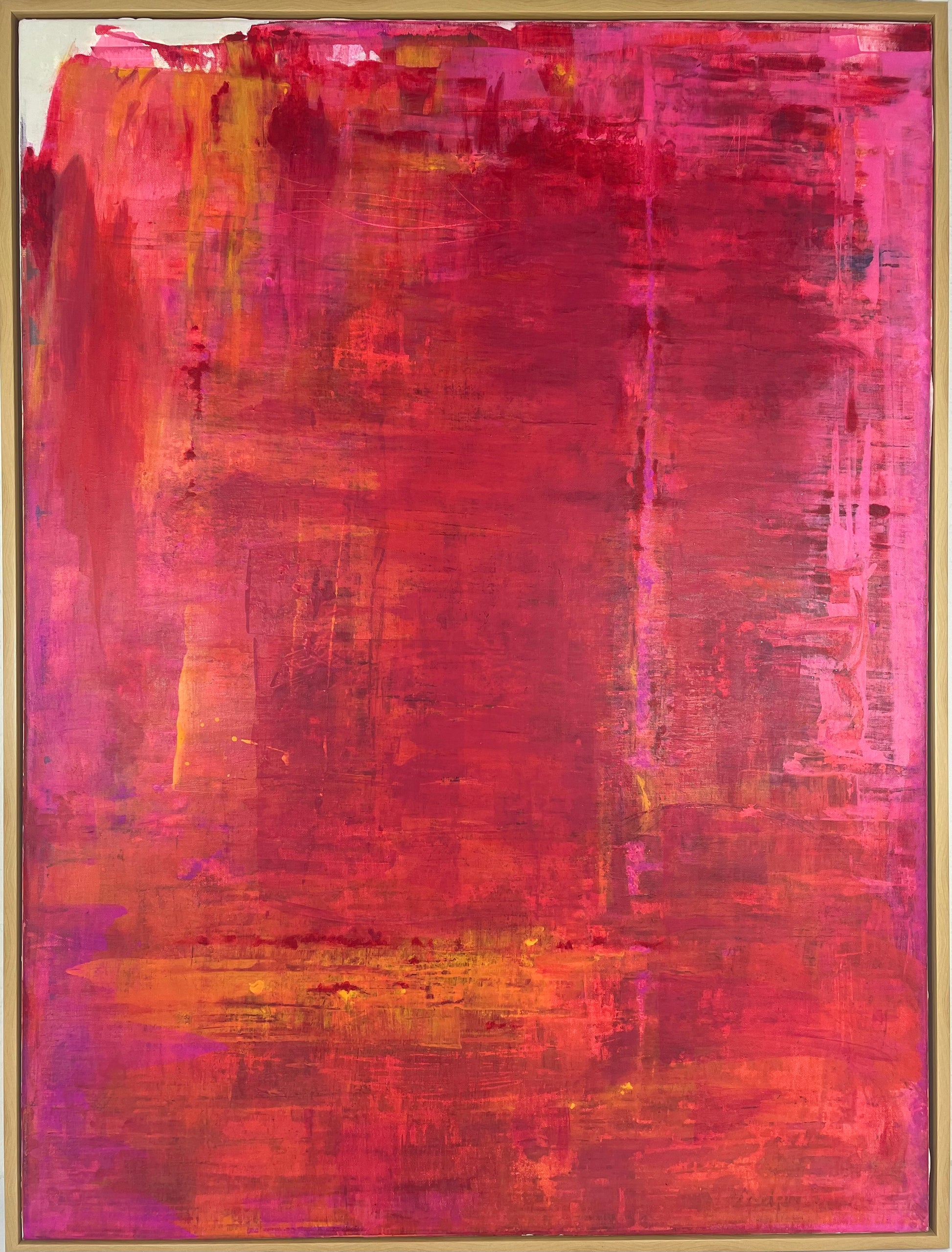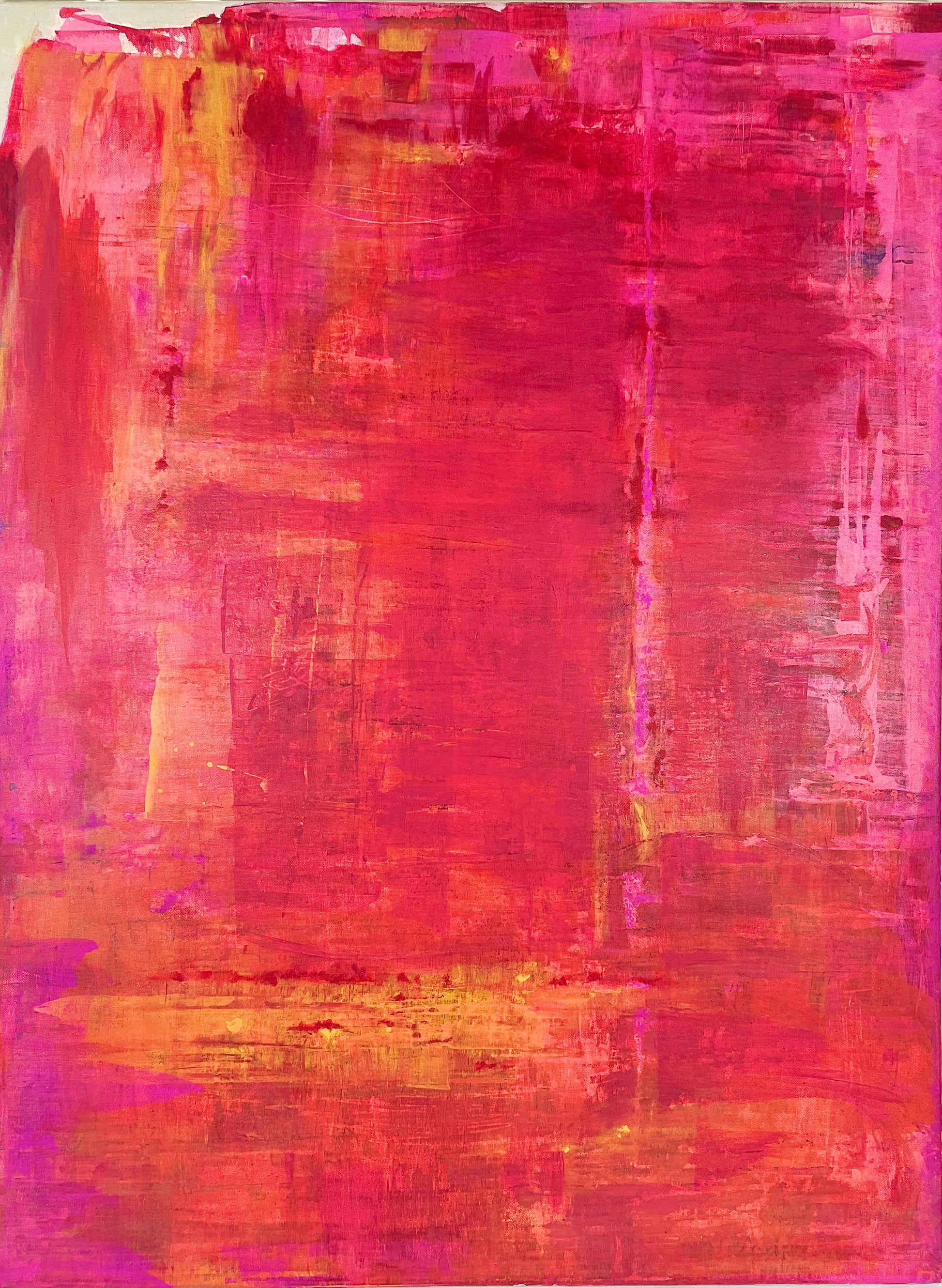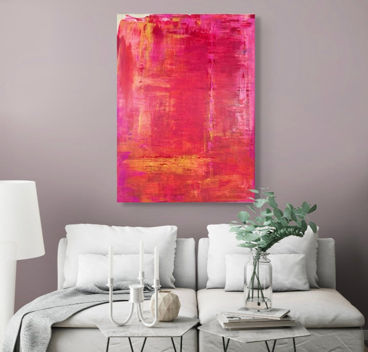 Multi-layered original abstract acrylic painting on canvas, featuring orange, ochre, saffron, crimson, scarlet, golden yellow, soft neon pink, violet and a fleck of gold.