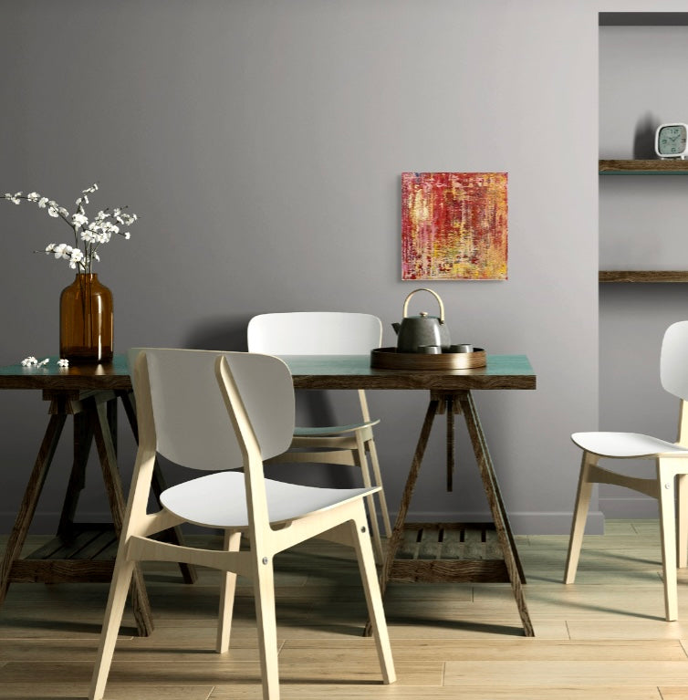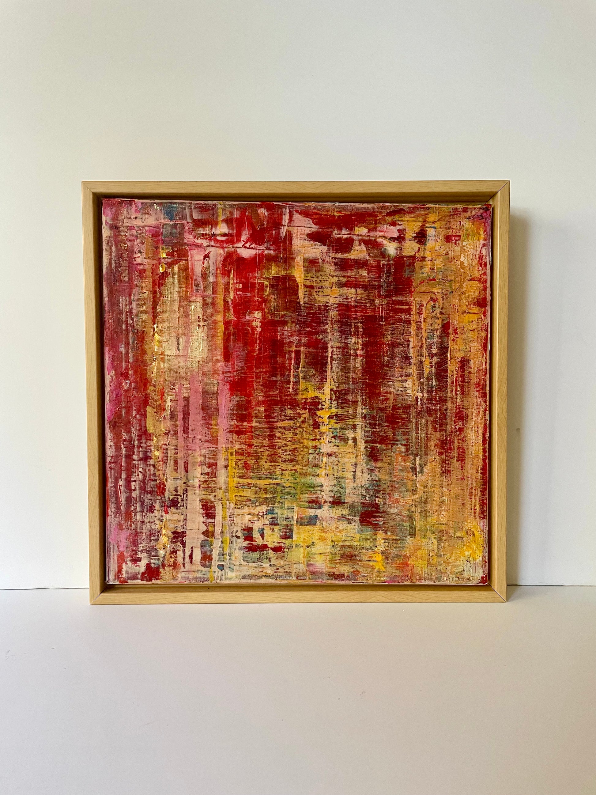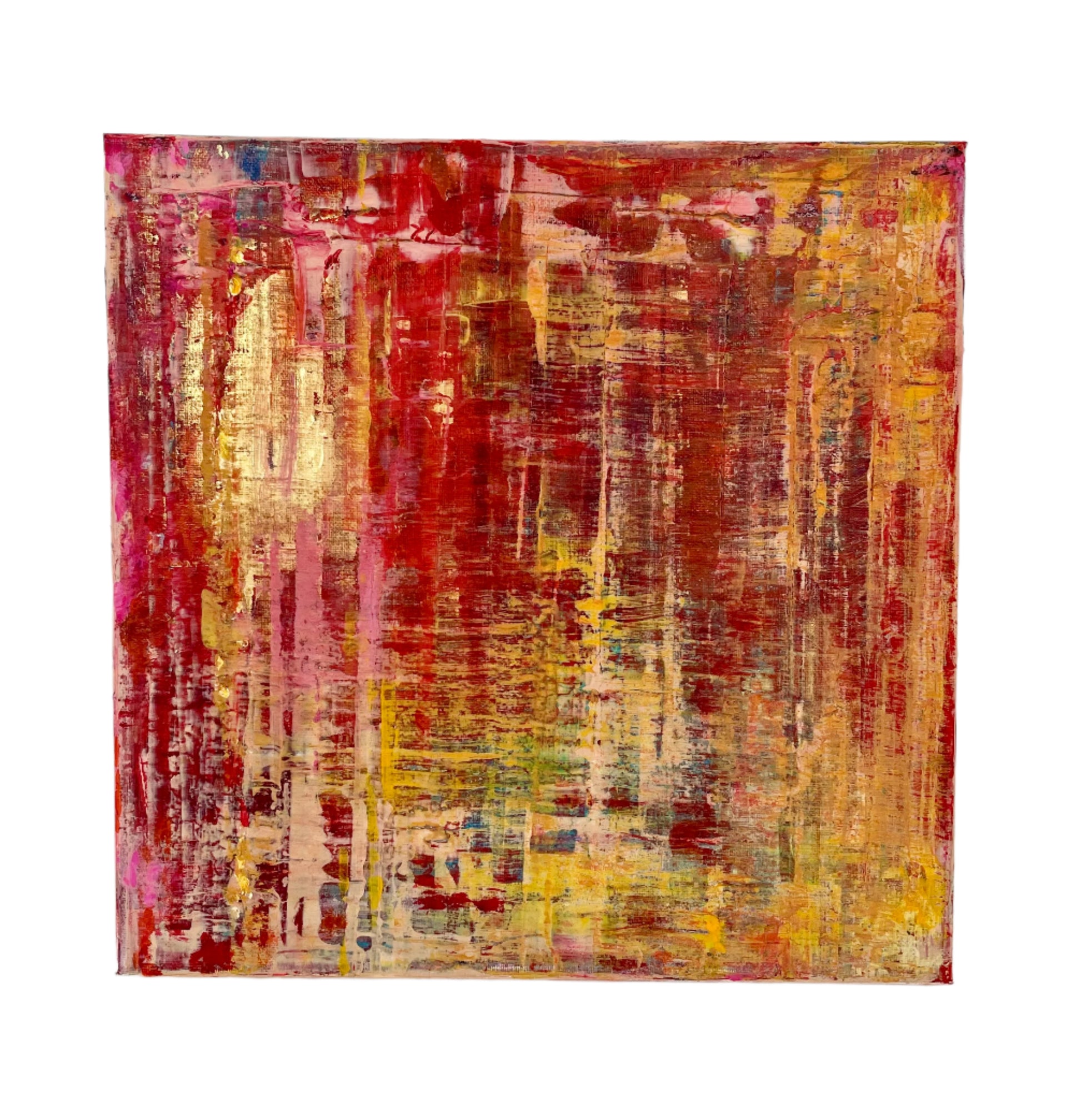 Multi-layered original abstract acrylic painting on canvas, featuring matte metallic gold, crimson, scarlet, bold yellow and teal.
