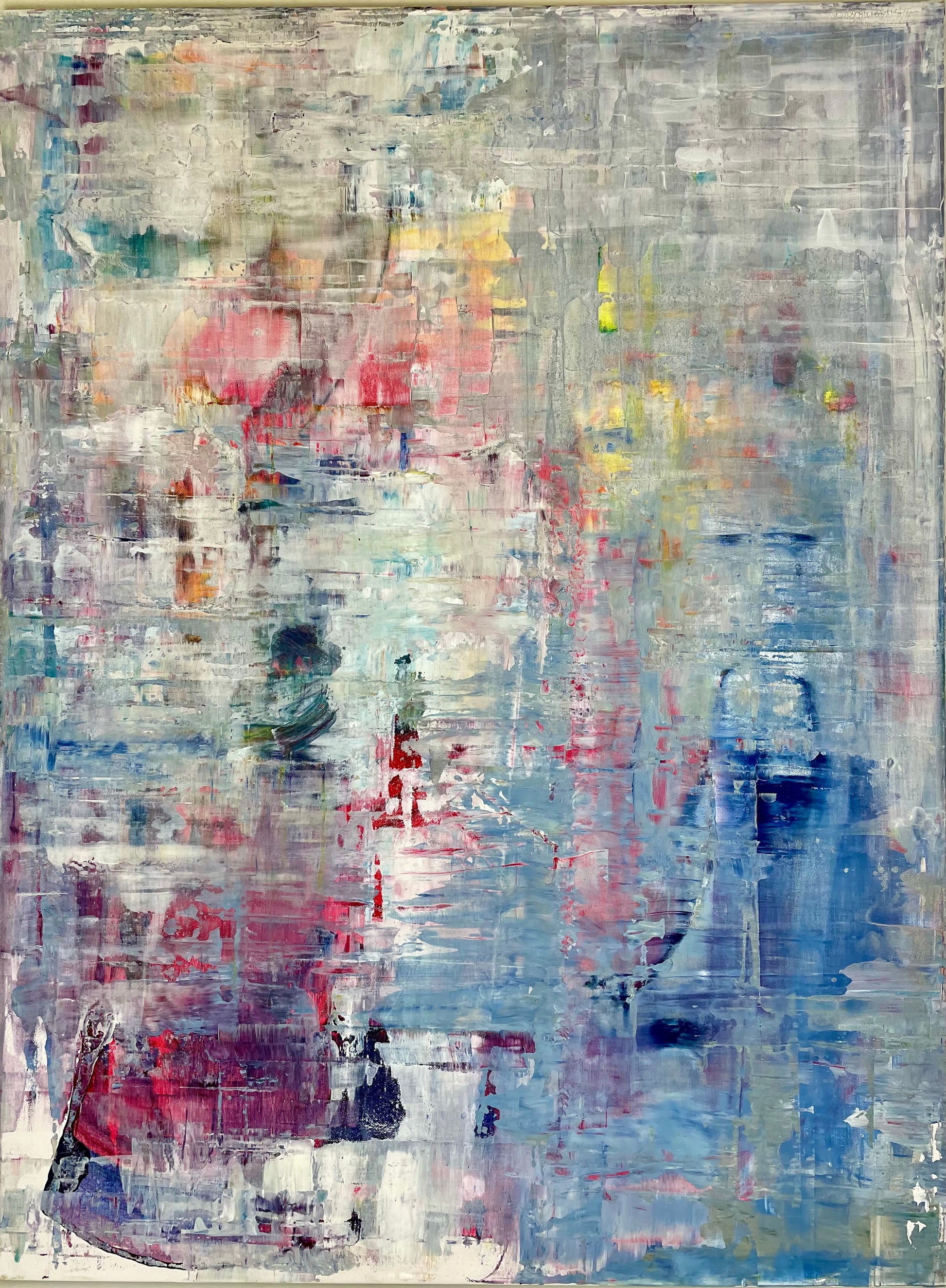 Wilderness backpacking in the California Sierras, the sheer, subtle joy of witnessing the soaring mountains at dawn, reflected in lakes with mirror surfaces softened by rising mists, was powerful. As it was being in the days, flooded with light. This painting is inspired by the awe of those memories, and the primacy of nature.