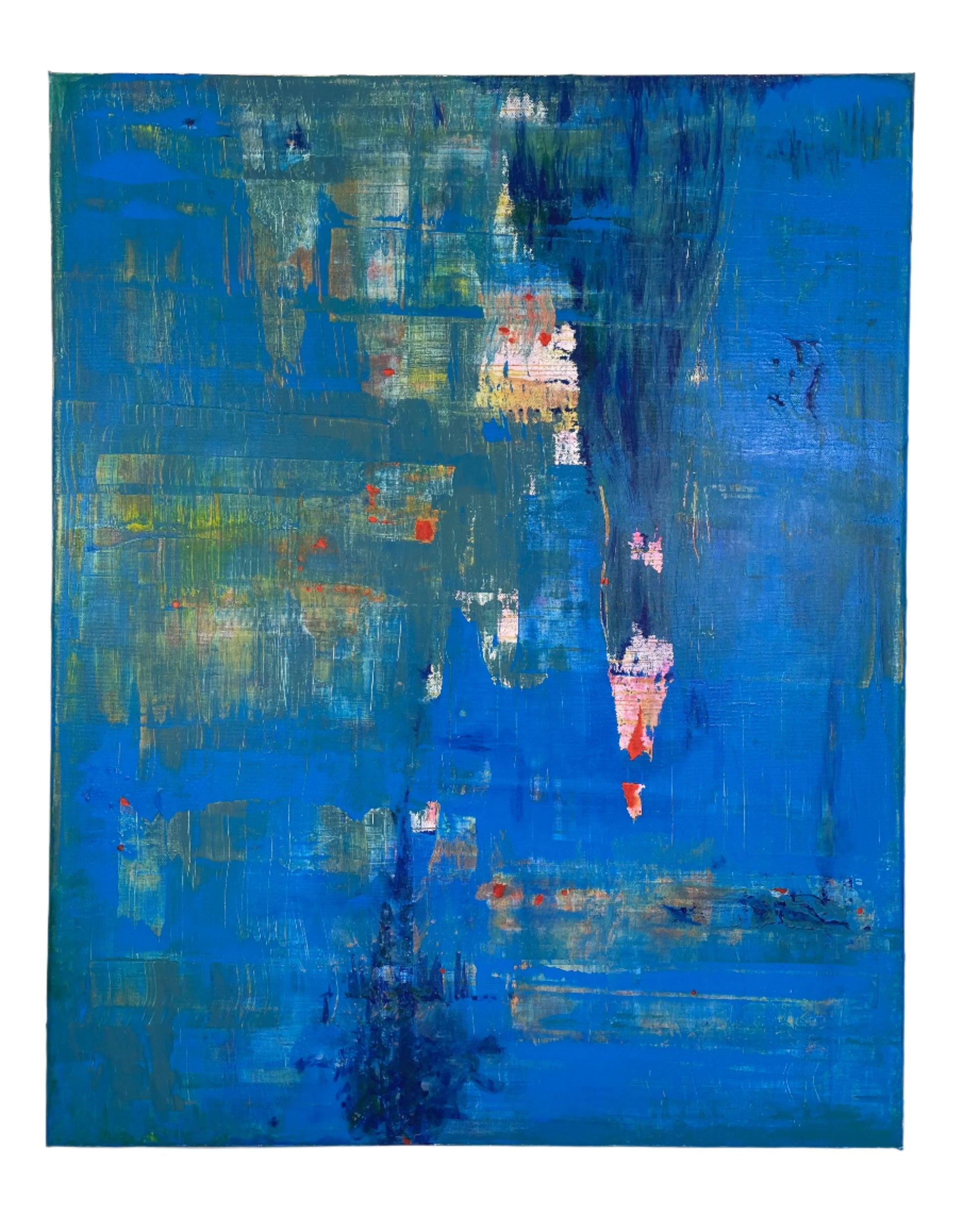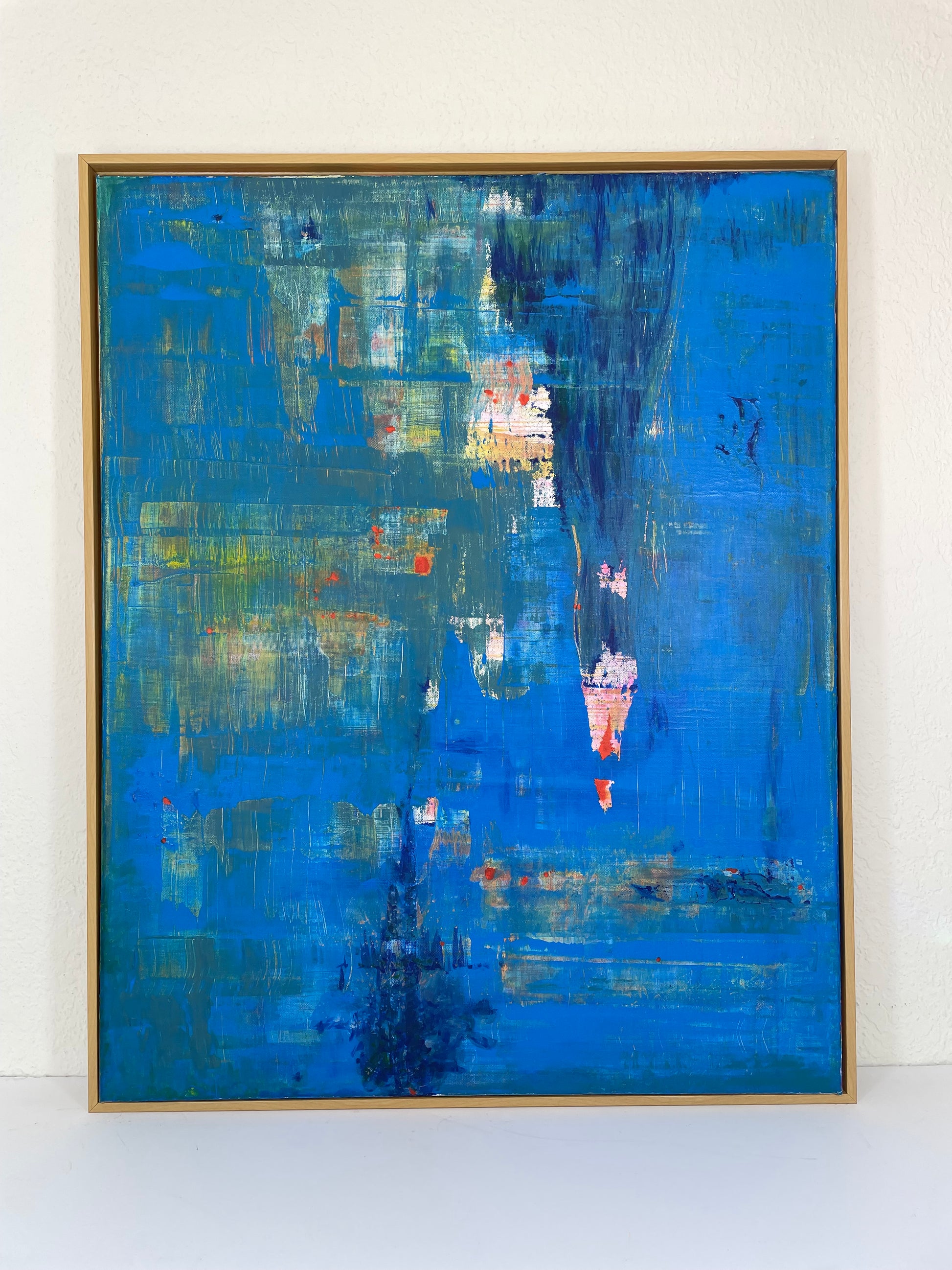 Multi-layered original acrylic abstract painting on canvas, featuring vibrant blues, cyan, moss green, persimmon and jade.
