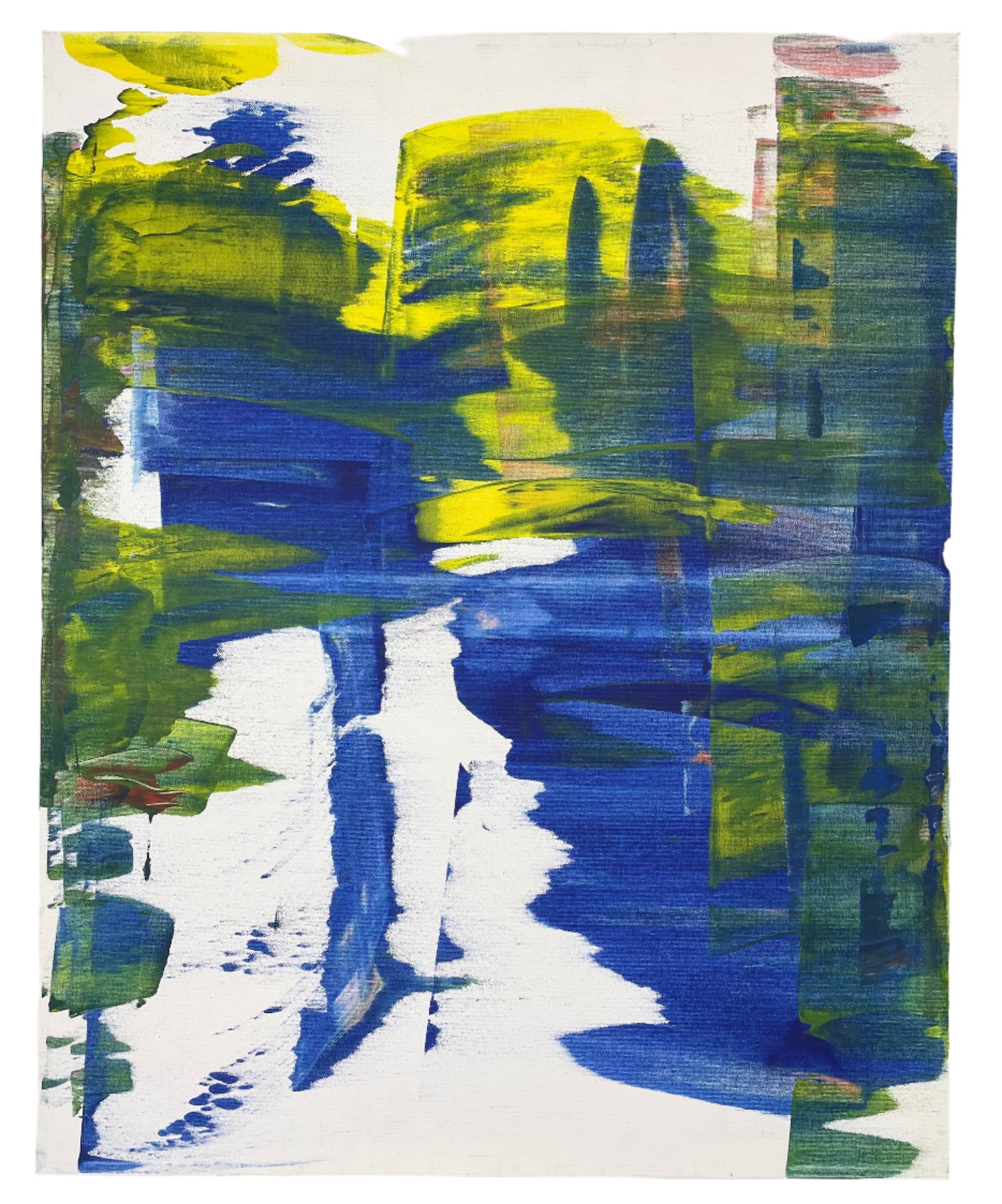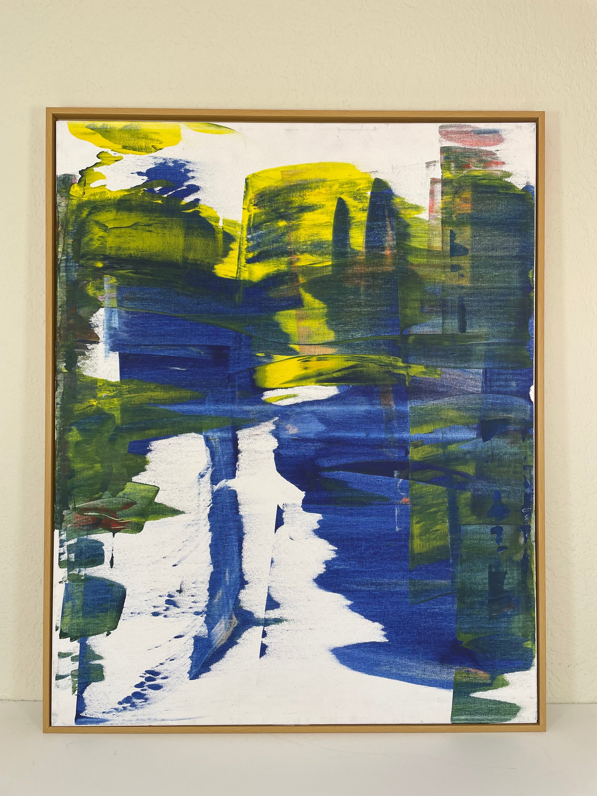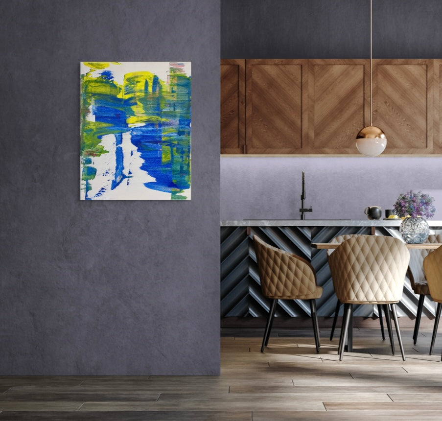Bold brush stroke original acrylic abstract painting on canvas, featuring deep blues, cyan, forest green, lemon yellow, and poppy red.