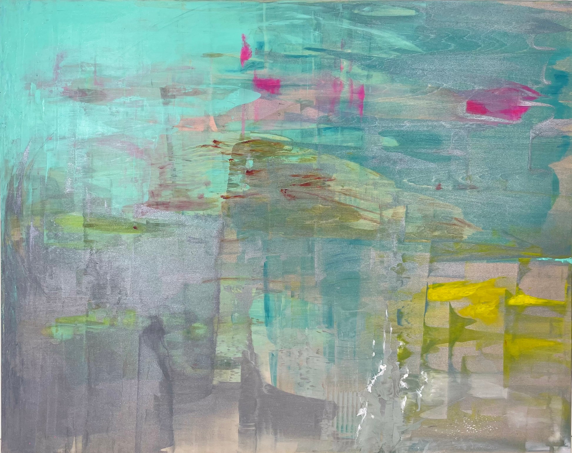 Multi-layered original acrylic painting on wooden panel, featuring soft dove grey, silver, soft green, lemon yellow, white, pewter and a touch of deep pink.